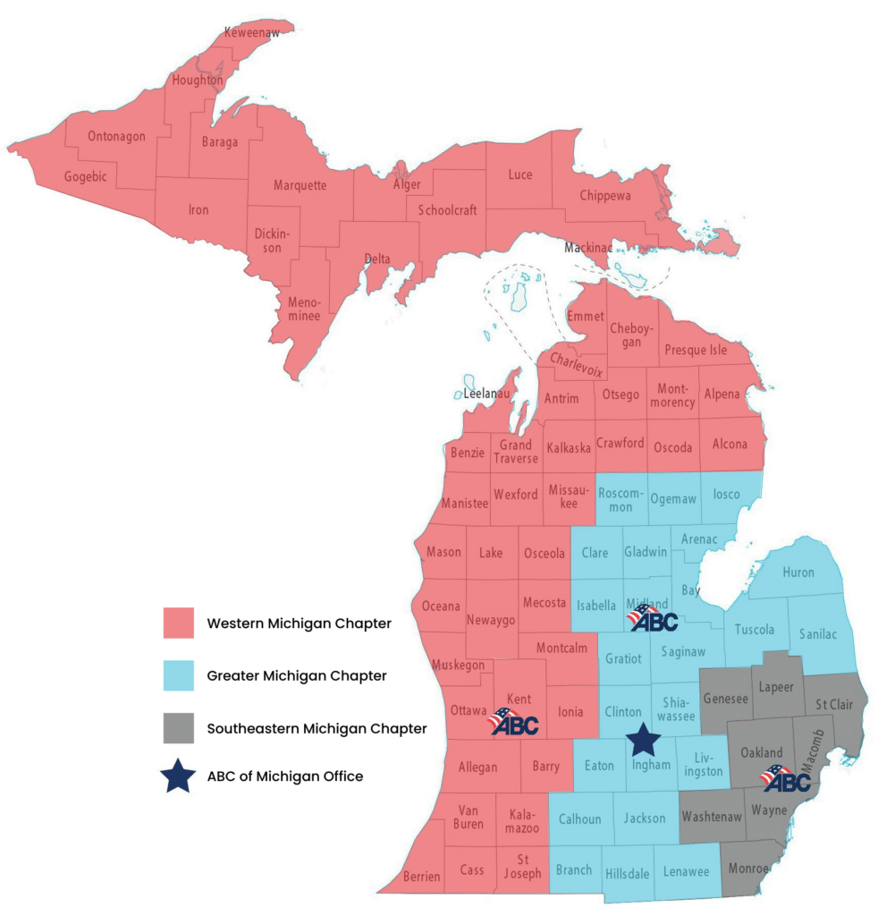 As the Associated Builders and Contractors Western Michigan Chapter, we represent the Western Lower Peninsula and the Upper Peninsula of Michigan. ABC Western Michigan was founded in 1956. Since the beginning, we’ve been focused on creating value for our members. We’re one of three regional chapters that provide resources, industry events, connections, training, and more to help advance the commercial and industrial construction industry.